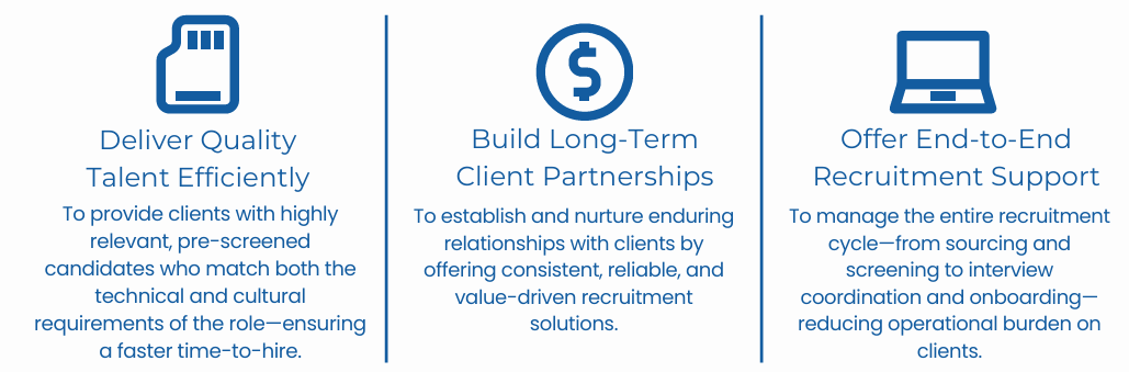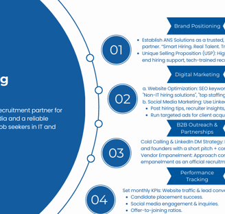 ANS Solutions is a recruitment consultancy specializing in IT and Non-IT hiring across domains like Marketing, Finance, HR, and Operations. We offer end-to-end recruitment services including sourcing, screening, interview coordination, and onboarding. With a strong focus on quality, speed, and relevance, our expert team delivers high offer-to joining ratios and ensures a seamless hiring experience. We aim to be a trusted hiring partner by providing skilled talent, timely solutions, and long-term value to our clients.